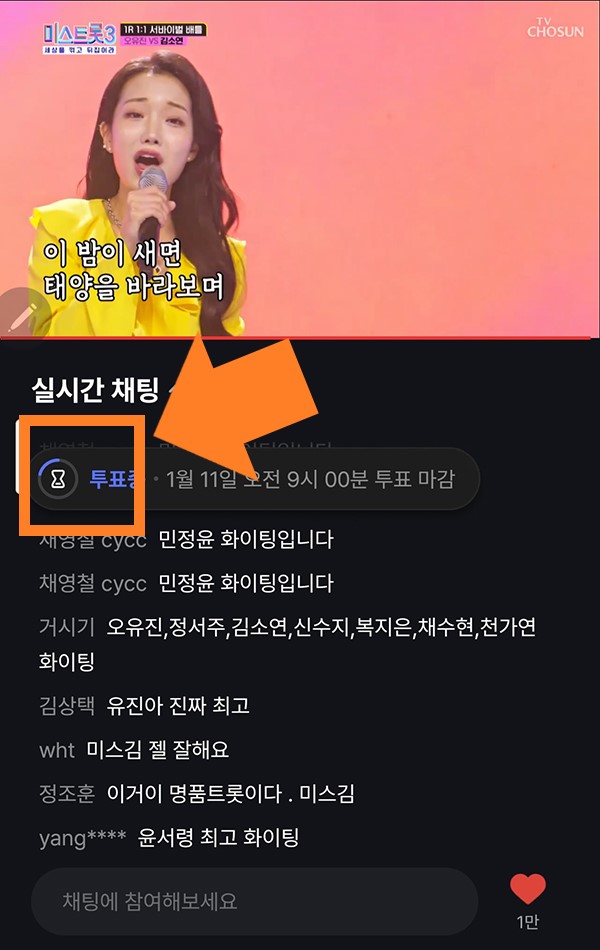 5. 미스트롯3 화면에서 "투표하기"를 부드럽게 눌러 줍니다.