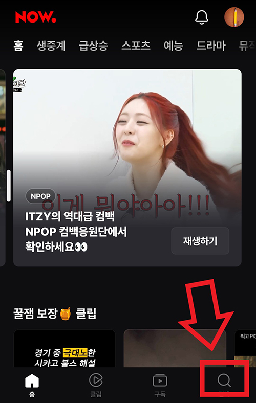 2. 설치한 앱('NOW' 앱)을 실행시킨 후 '검색' '돋보기'를 누룹니다.