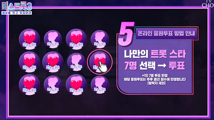 4. 미스트롯 참가자 얼굴이 나타나면 7명을 선택함. (1일 한번만 투표가능)