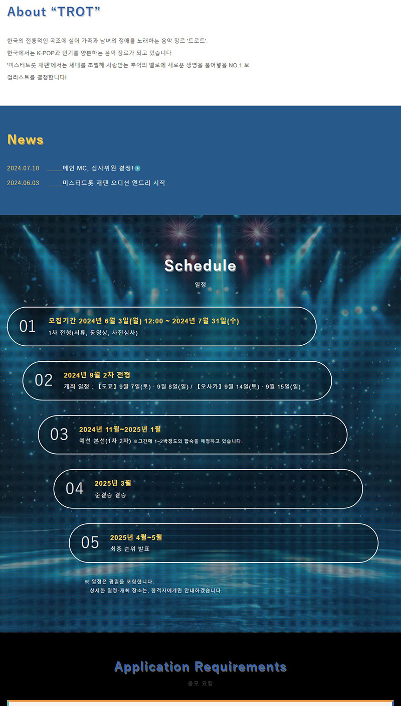 '미스터트롯 재팬' 홈페이지 (한글번역본, 일본원문)