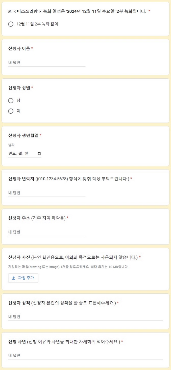 미스쓰리랑 방청 신청 방청단 모집 2024년 12월 11일 녹화 1부,녹화 2부