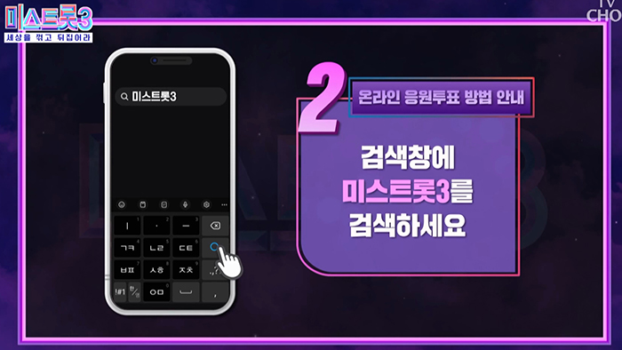 2. 검색창에 '미스트롯3'을 입력하고 검색 버튼을 터치.