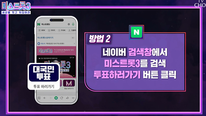 미스트롯3 투표는 스마트 폰에서 네이버의 "NOW." 앱 설치가 되어 있으면 가능합니다.