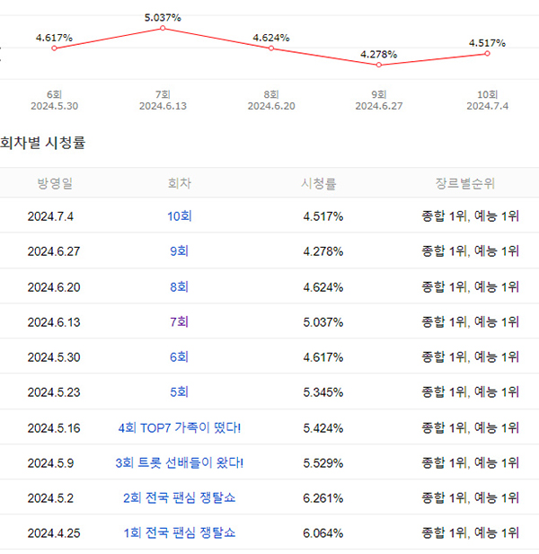 미스쓰리랑 10회 시청률 4.517% (닐슨코리아 7월4일 방송)